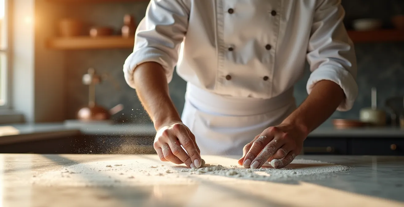 La première marche vers l’expertise est la maîtrise du langage. En pâtisserie française, le vocabulaire n’est pas un simple jargon destiné à exclure les non-initiés ; c’est un outil de précision absolue. Utiliser le terme « fleurer » plutôt que « fariner » n’est pas du snobisme. Fleurer décrit un geste technique spécifique : disperser une fine et uniforme couche de farine pour éviter qu’une pâte ne colle. C’est un mouvement du poignet qui témoigne d’une maîtrise et d’une économie de geste. Dire « fariner » est générique, tandis que « fleurer » démontre la compréhension d’une action précise avec un résultat attendu. C’est ce qui constitue le lexique du savoir-faire.
