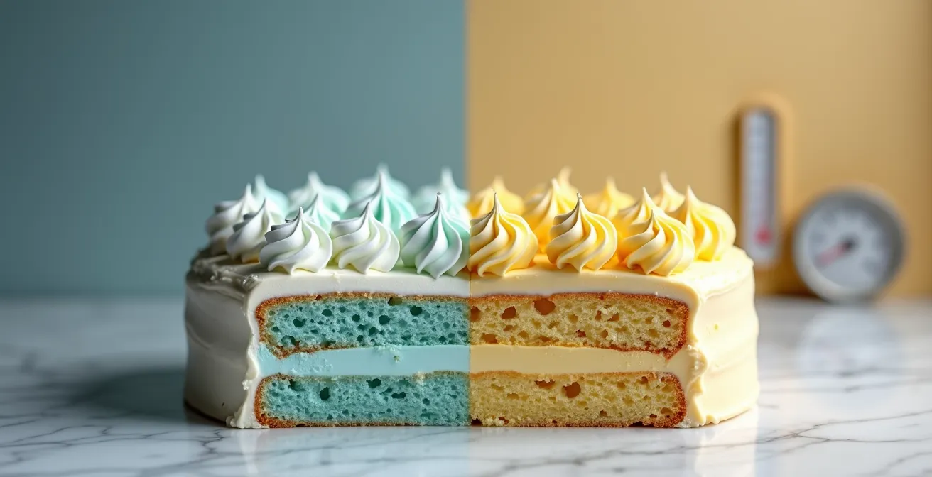 Le drame de tout cake designer : voir son œuvre, lisse et parfaite, commencer à transpirer, à s’affaisser et à perdre ses angles nets après seulement une heure sur le buffet. Ce phénomène n’est pas une fatalité, mais la conséquence directe d’une loi physique simple : le point de fusion du beurre. Quelle que soit la perfection de votre recette (Suisse, Italienne ou Américaine), si la température ambiante dépasse un certain seuil, la matière grasse qui structure votre crème commencera inévitablement à passer de l’état solide à l’état liquide.