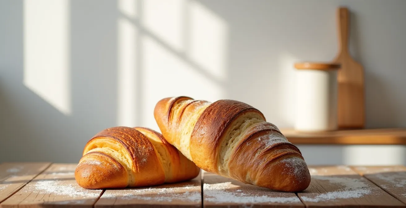Si la brioche est le test de la force, le croissant est celui de l’équilibre. Pour cette viennoiserie emblématique, le défi est double : obtenir un feuilletage croustillant et aérien, tout en conservant une mie fondante et une bonne mâche. L’utilisation d’une seule farine peut s’avérer délicate. Une T45 de gruau, très forte, peut donner un croissant trop tenace, manquant de fondant. Une T55 classique, quant à elle, peut manquer de structure pour supporter les nombreux tours et donner un feuilletage moins défini.